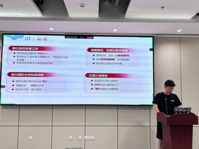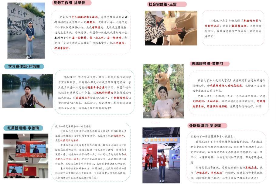 新一届党服中心主任吉一一介绍本届党服中心由47名学生党员组成,明确以“战斗堡垒、服务平台、亲民平台、导航平台、学习平台”为定位。各工作组组长现场汇报工作计划:党务工作组将优化党员发展全流程管理;红苗管理组聚焦红苗计划入党积极分子分配考核;学习宣传组推出标准化新闻模板和互动式理论学习;外联协调组统筹红色教育后勤保障;志愿实践组强化活动组织与考核机制。