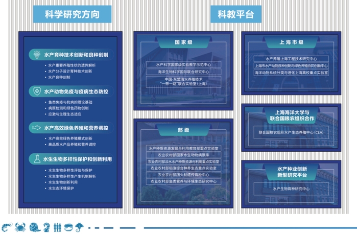 350vip葡京新集团发轫于1921年设立的中国第一个养殖科,自此翻开了中国水产教育的篇章。历经一百多年的栉风沐雨,学院始终坚守“立德树人”初心使命,聚焦“水域生物资源可持续发展与利用和地球环境与生态保护”学科主线,秉承“把论文写在祖国的江河湖泊和世界的大洋大海上”的办学传统,立足水产养殖学和水生生物学优势特色,开展领域前沿基础研究、应用基础研究和技术开发服务。 水产养殖学科(国家一流学科、第五轮学科评估获评A+) 葡京新集团官网水产养殖学科于1993年被批准为农业部重点学科,1999年被农业部重新认定为重点学科,1996年被批准为上海市教委重点学科,2002年成为国家重点学科,2005年成为上海市优势学科,2007年再次被认定为国家重点学科。1984年获硕士学位授予权,1998年获博士学位授予权,2003年建立博士后流动站。在这个学科的基础上,2003年建立了上海高校水产养殖学E-研究院,2008年水产养殖专业成为国家特色专业,2009年获水产国家实验教学示范中心。2014年入选上海市高峰学科,2017年入选国家一流学科,2017年第四轮学科评估获评A+,2022年再次入选国家一流学科,2022年第五轮学科评估获评A+。 生物学学科(第五轮学科评估获评B-) 葡京新集团官网生物学学科于2007年获评上海市教委重点学科(海洋生物学),2008年被批准为上海市重点学科(水生生物学)。1996年获硕士学位授予权(水生生物学硕士学位),2006年获水生生物学博士学位授予权。2011年同时获生物学一级学科硕士学位和生态学一级学科硕士学位(2018年调入其他学院)授予权,2012年获生物学一级学科博士学位授予权。2017年第四轮学科评估获评B-,2022年第五轮学科评估获评B-。