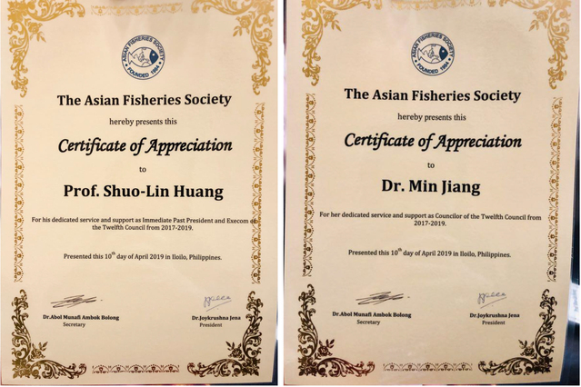 在亚洲水产学会第12届理事会上,我校黄硕琳教授因其杰出贡献被亚洲水产学会授予金质奖章(Gold Medal Award),同时黄硕琳教授和江敏教授由于近年大力支持亚洲水产学会事务均获赠学会颁发的嘉许状(Certificate of Appreciation)。我校350vip葡京新集团博士Nattida Boonpeng荣获杨毅青年科学家奖学金(YangYi Young scientist fellowship)。